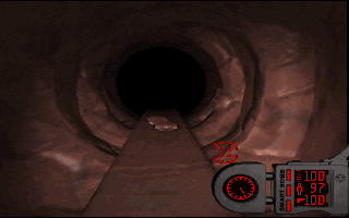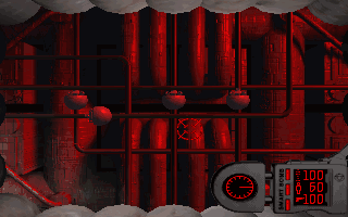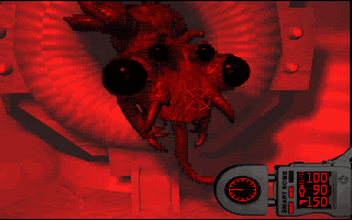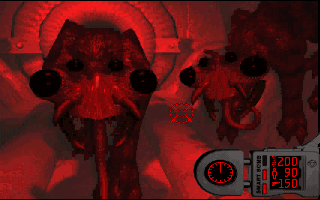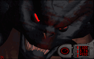 P: Two large doglike creatures appear in the corridor here. Note that the health meter for the monsters is initally set at 200%