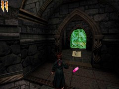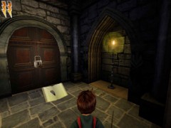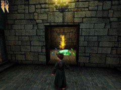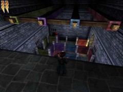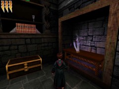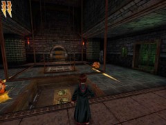 The two chests in the corners each contain a Chocolate Frog. Ride the beam downward and jump to the middle window. Inside is a cauldron to flip aside for BB Beans. Cast Lumos on the Gargoyle and watch a cut scene on the gaps between the stairs in the lower passage.