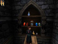 Take all the Beans from the shelves to your left and open a bottle containing Flobberworm Mucous. Grab more Beans on the next shelves and turn around the corner. You�ll suddenly drop down through a trap-door and end up in a cave with two fire Crabs sitting on blocks above some acid looking green substance.