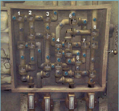 At the top of the steps, keep going forward to the far right end; you will find a "hexagonal hole" at a pipe junction. Then take the pipe valve from your Inventory and click it on here. After it is attached, click on it again to turn it; this will power up the machine. Then, go over to the machine to the left, and click on the part where you see the little light bulbs glowing on the top. The object of this puzzle is to get the stone/rock to drop into the hole. When the puzzle interface comes up, the first thing you do is to pull the lever on the far right side. Then, click on the right-hand side of that wheel four times; then, pull the lever on the right-hand side once more. Then, click on the right-hand side of the wheel once; and then pull the lever on the right-hand side one more time. Then click on the right-hand side of the wheel four more times; and then click on the lever on the right-hand side one more time. Then click on the right-hand side of the wheel once; and then click on the lever on the right-hand side one more time. Then click on the right-hand side of the wheel four more times; and then click on the lever on the right-hand side one more time. Click on the right-hand side of the wheel one time; and then click on the lever on the right-hand side one more time. Click on the right-hand side of the wheel four more times; and then click on the lever on the right-hand side a final time: The stone will drop. You will then see the cage door open up below you. Go down the stairs and then make a left at the intersection and enter the center door which had just opened for you. Watch the video sequence.