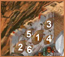 Climb up the flight of steps in the stone tower area, and then to the right cross over that spider web (you still have to be Sarah to do this). Then change back into the Aztec warrior. Notice the "plates" on the floor in front of you; from left to right, click on the plates in this order: 2nd, 5th, 3rd, 1st, & 4th. Then, click on the impaled Aztec warriors and notice that they are screaming. Then change into the four-armed cyclops and push the big stone head that you see in front of you all the way to the rear. Then a huge crystal monolith will pop up behind you where the giant head was. Then in order to shatter this crystal monolith, you have to click on each of the Aztec warrior's impaled bodies to impale them further upon the stakes. When all six of their screams build to a crescendo, this will shatter the crystal monolith. You may now get the right wing of theangelic statue. Change back into Sarah, and cross back over the spider web. Go back down the stone steps; at the bottom, cross over to the right.
