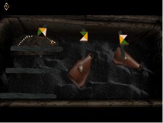 Walk left on the small ledge, talk with the dwarf “Alberich” in the cage. Go left and jump on a big cabinet. Jump down at the left side from the cabinet, walk up left in a box with salt, sprinkle some salt over your body, walk out the box and move down. Walk to the outside door, move right, move to a cabinet with cutlery inside, climb on that cabinet (bounce to the left front leg and climb up), jump left on a statuette with a key, take the key. Jump from the statuette, move to the right and climb the cabinet with 6 drawers. Jump on the ledge, walk to the cage with the dwarf and give him the key. After the movie clip climb down, move to the trap, up near the trap take the garbage, use the garbage in front from the trap, take the spider’s leg, use the spider’s leg in the acid pouch from the spider and you have a acid pouch on spider’s leg. Walk to the cabinet with the 6 drawers, left from the cabinet are a trunk, use the acid pouch on spider’s leg in the lock from the trunk, slide the broken sword “nothung parts” out the truck.