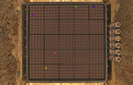 Or just look at the diagram below for the proper placement of the gems. Using text mode coordinates, assuming that the lower-left corner is (0,0), then the red marble goes at (8,8), the orange at (5,3), the green at (15,24), the blue at (21,24) and the purple at (1,21). Now head back, pull the lever down and push the white button. You know youve done it right if you hear a drilling like sound after pushing the white button. This now gives power to all of the linking book domes.