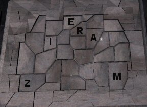 Correlate the stone pads' number of spokes and circles with the projection of Ramirez' name on the ceiling.