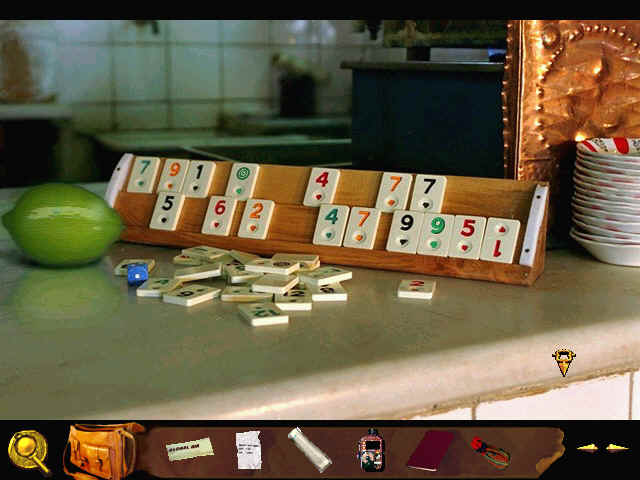 A : Look around the street. Hmmm.... what a coinsidence that this construction office is located just at the back side of Nargile Bar. Maybe they know something. Go there and look inside. Remember the notebook you've found inside Mehmet rug store. This is the right time to check what is the writing again. Notice the connection between today and lemon. There is a lemon sitting on the counter. Examine its color. Now look at the number on the board, just next to it. Look only at the green color number (the color of the lemon). That is your passcard number (7049).