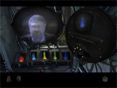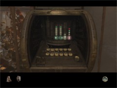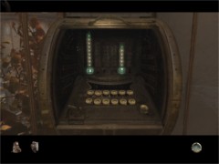 Zoom out and press the red button on your chair to go down. Turn around and step on the platform. Turn to the right and walk toward the Crystal Viewer. Notice that all the crystals are burning now on top of the device. It should work properly now. Zoom in on the Crystal Viewer. Your goal now is to get in touch with Atrus. First of all save your game. You never know when something will go wrong.