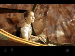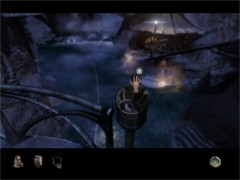 You start your adventure in a gondola with Yeesha, the daughter of Atrus and Catherine. Hang-on and join the ride! When you arrive in front of the landing platform, Yeesha will stop the gondola to enjoy the view. She tells you to make a picture of the nice view. She warns you not to place your finger in front of the lens because her father does that and always ruins his pictures. To take a picture, click on your right mouse button. Then move the cursor to the photo camera at the bottom left side of your screen. Make sure you have the landing platform in your viewer and then press the left mouse button for your first picture.
