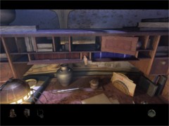 Turn to the left and zoom in on the fancy dress. Click on the amulet. Zoom out. Go further to the left and study the desk. Zoom in on the crystal and click on the amulet. Zoom out. Walk further to the left and stand in front of the bookcase. Zoom in on the glass doors beneath the books. In the left cupboard you'll see some kind of book and in the right cupboard you'll see some kind of cloth. There is no way to open these cupboards. Now have a look at the books. Notice a lot of books with D'Ni language on the backs as mentioned in Yeesha's diary. Remember that she wrote that she doesn't forget anybody's age.