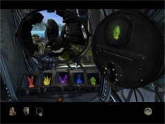 Zoom in on the glass tank with the fireflies. Click on the amulet. Zoom out. Turn to the right and walk toward the wall with the lit bulbs. Open the center bulb and zoom in on the plant. Click on the amulet. Turn a little to the right and exit the room. Enter the greenhouse at your left side and continue until you reach to the bucket filled with water. Exit the greenhouse and walk to the elevator. Pull the lever of the elevator and get in.