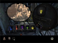 Now move the little lever over the yellow dot. Be sure that you move the slider all the way back to the left. Now move the slider slowly to the right and be sure that you see the sixth image of a crystal. Then press the fifth button underneath the display. This opens the lid and you'll see that the same shaped yellow-colored crystal is now in that box, which makes the series complete. Now press the large button beneath the five small buttons. If you did this correctly, you'll see an image of Haven. If not, you have done something wrong. In that case give it another try until you succeed.
