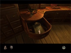 Turn to the left and study the pans on the left side above the sink. Click on the amulet. Zoom out. Turn around and study the stove. Click on the amulet. Go to the right and walk toward the lounge suite. Zoom in on the picture of Yeesha. Zoom in on the chessboard and click on the amulet. Exit the living room and step on the platform on the right side. Pull the lever on the railing at the right. The wooden bridge changes position and now leads to Yeesha's bedroom.